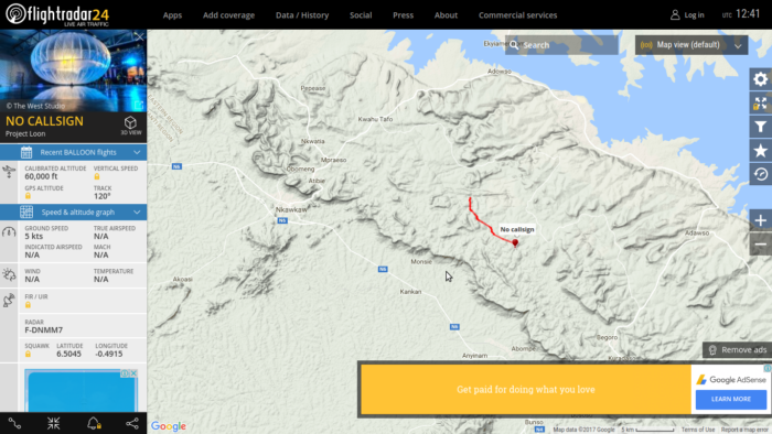 I am fond of once in a while tracking what’s flying in Ghana’s airspace. And lo and behold, I see this Project Loon flight with a “No Callsign”.