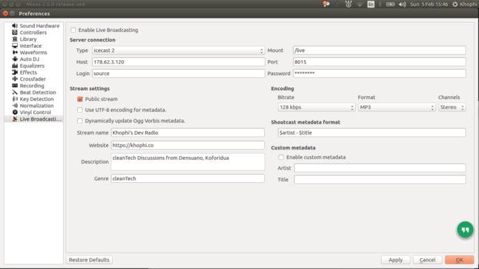 Icecast will be installed on our Server, then the Mixxx player will beam our broadcast to the server, from which listeners will tap the audio from.
