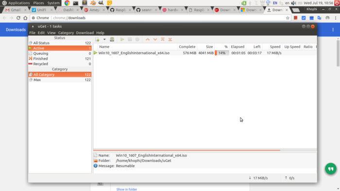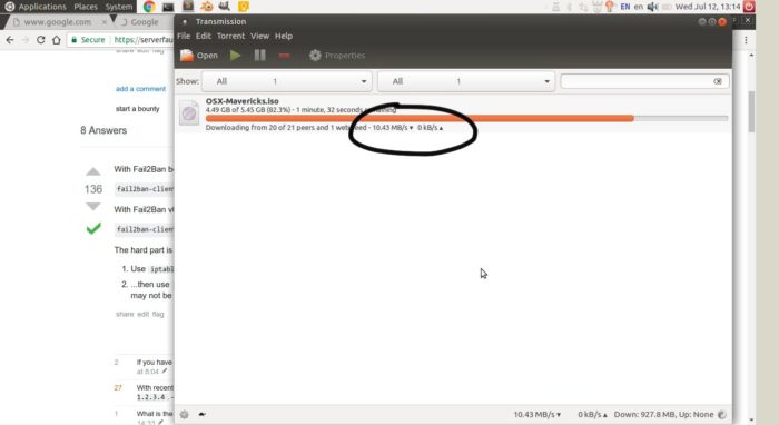 Plugged in one network cable to my computer which was dangling around close to our Pi 3 boards. Transmission Torrent downloader did the rest, and in less than 1 minute, the remainder of the OSX Maverick download I started in the house was pulled down.