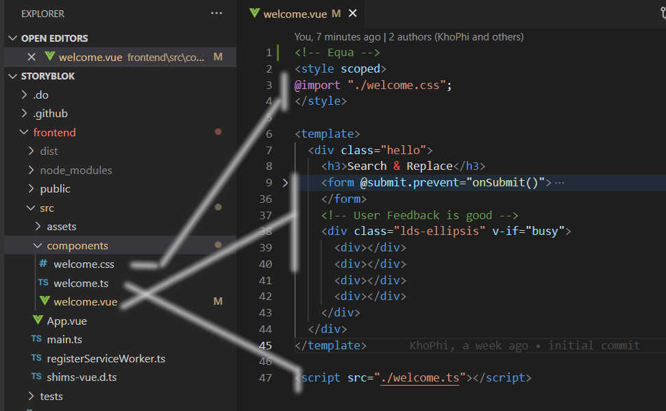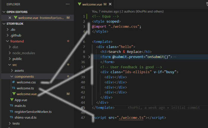 I like to maintain my sanity when writing code. One easy way I do so it keeping codes separate based on what they’re about. HTML CSS and Javascript are all kept in separate files, .html/.vue, .css/.scss, and .ts/.js respectively