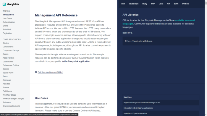 Storyblok API docs is detailed enough to offer the overview one needs to get started. And I say this because I was able to locate the docs, create an account, and start hitting the API all under 90 seconds, something that I appreciated a lot.