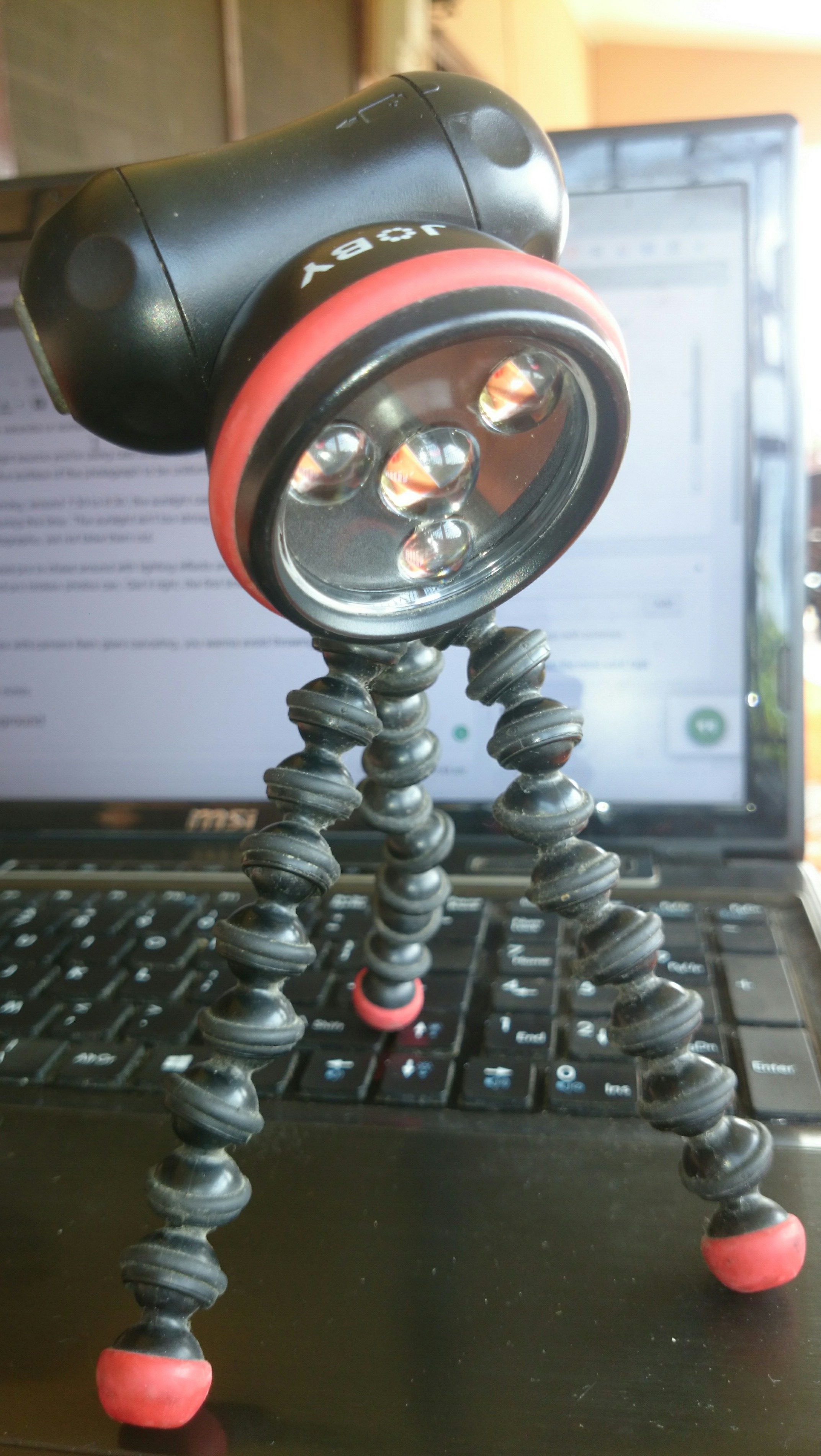 The Joby lamp has 3 levels of brightness. Depending on lighting condition in the room, tap to the level suitable. I point it an angle to the photograph, then perpendicular to the photograph is where my camera shot comes in from.