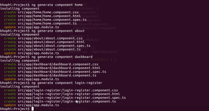 ng generate component home ng generate component about ng generate component dashboard ng generate component login-register