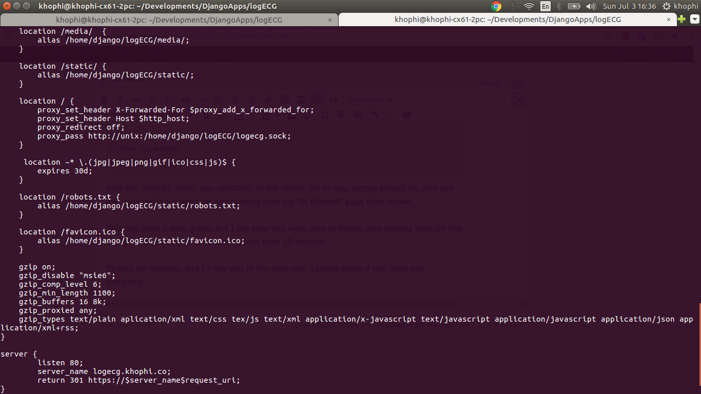 With the Django running daphne up and running, let’s proxy Nginx requests to it accordingly